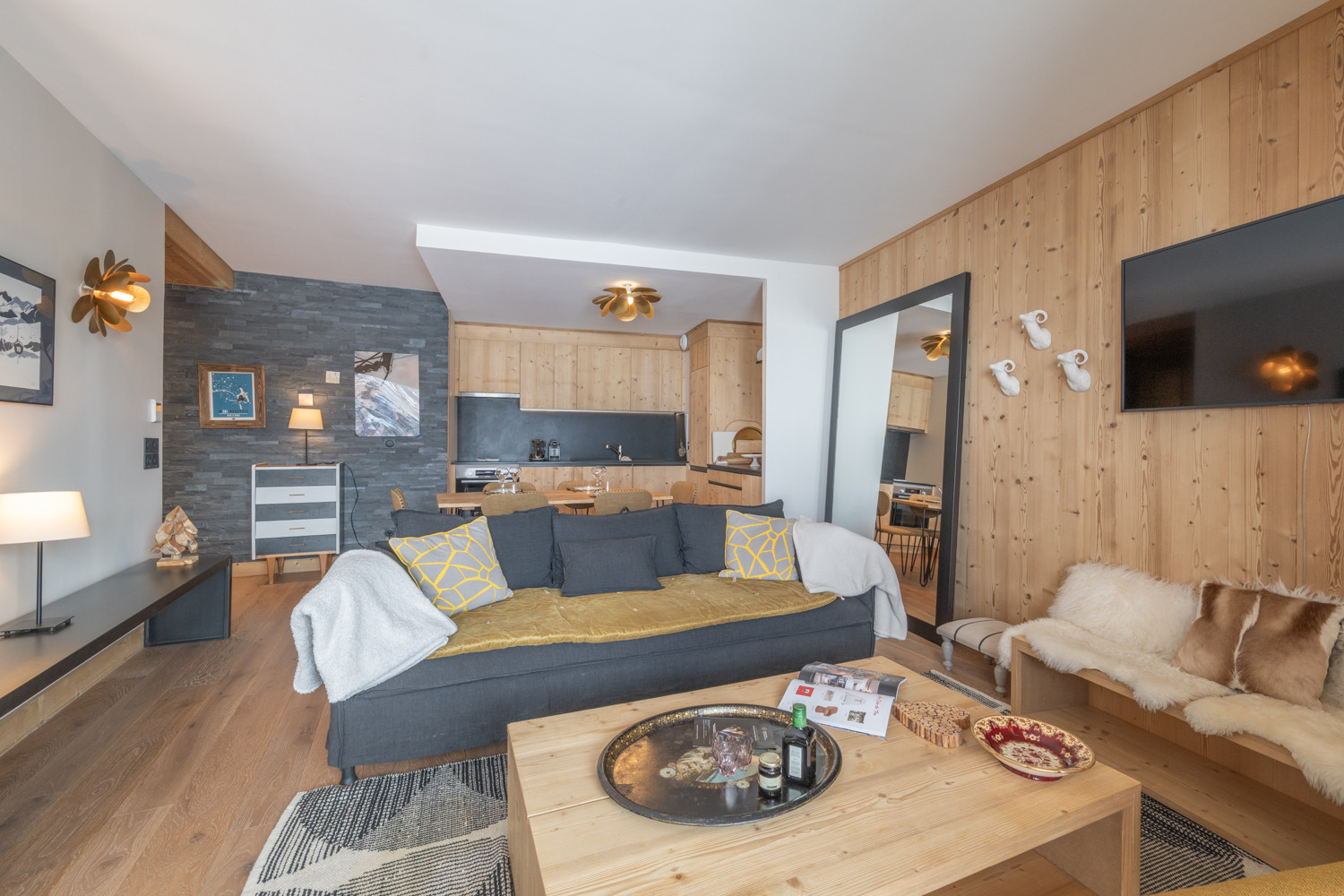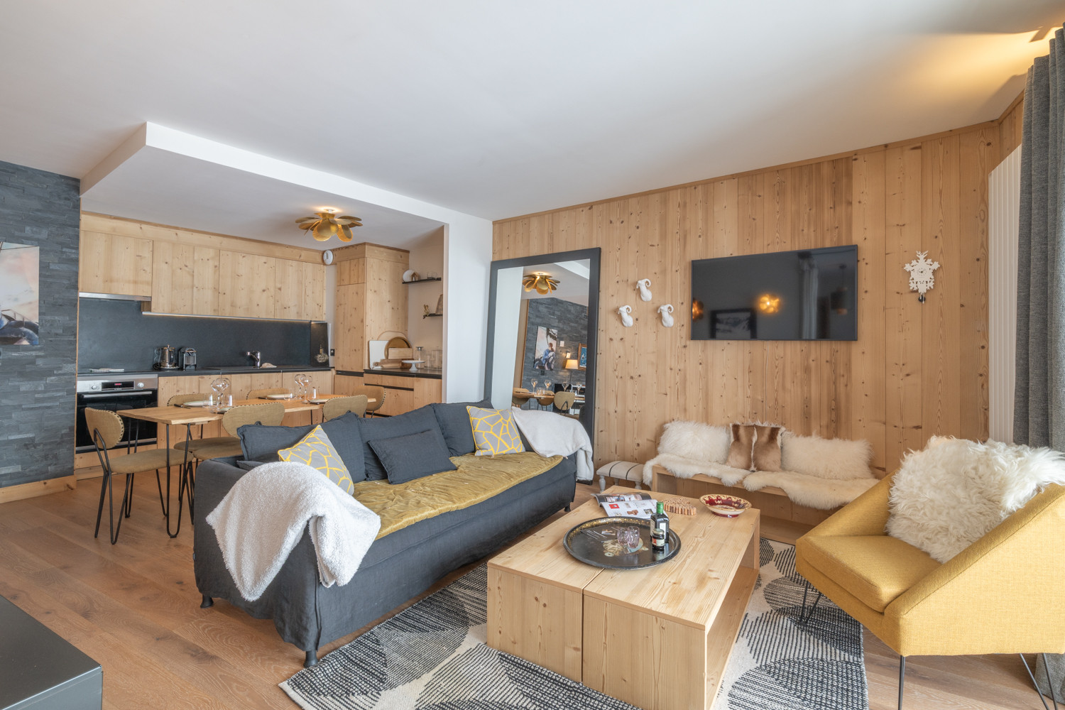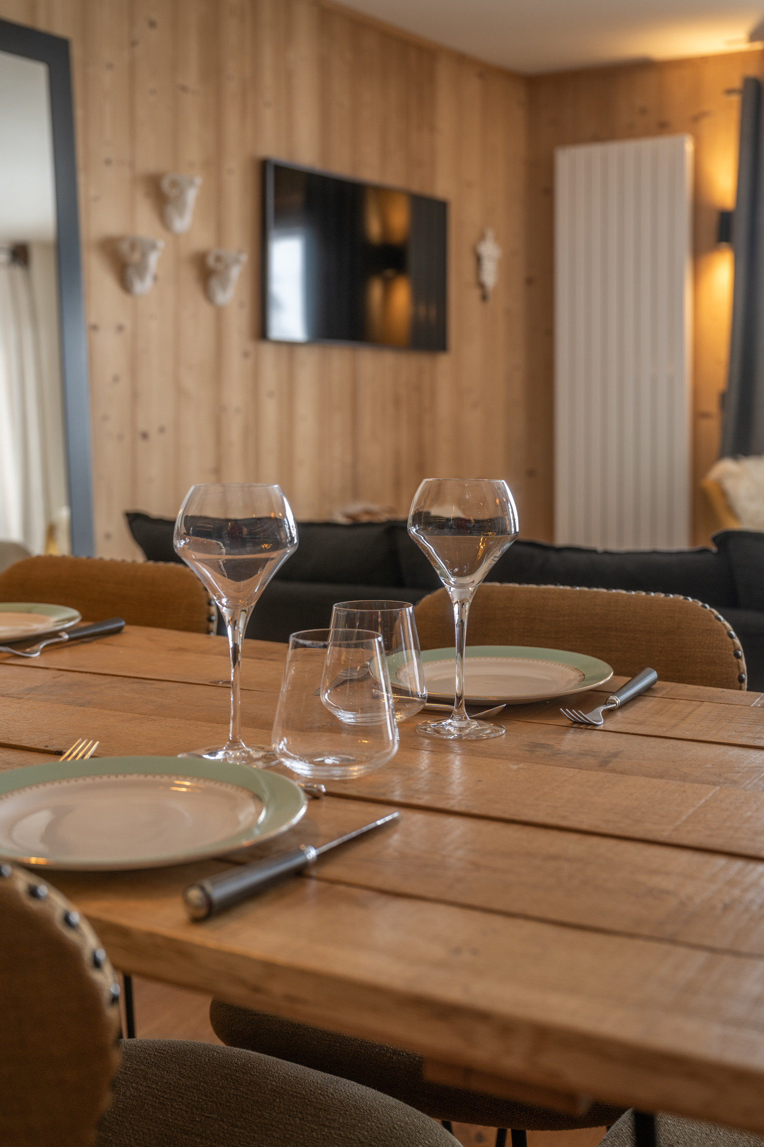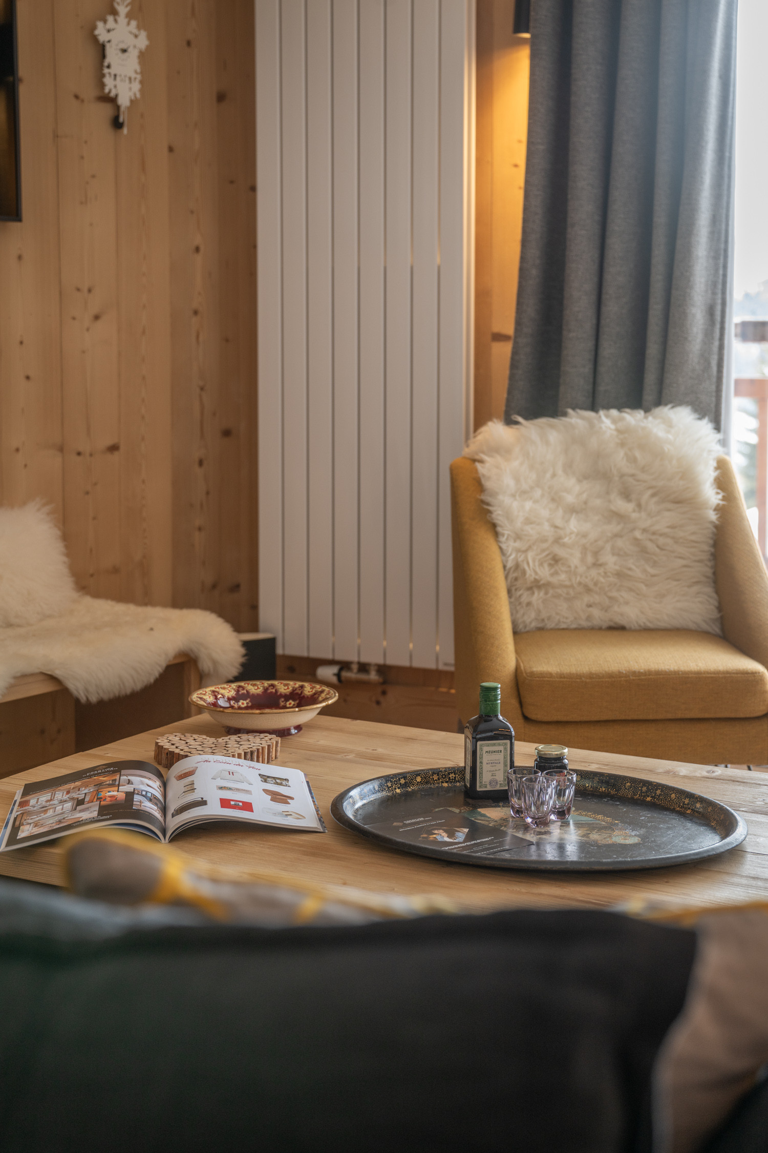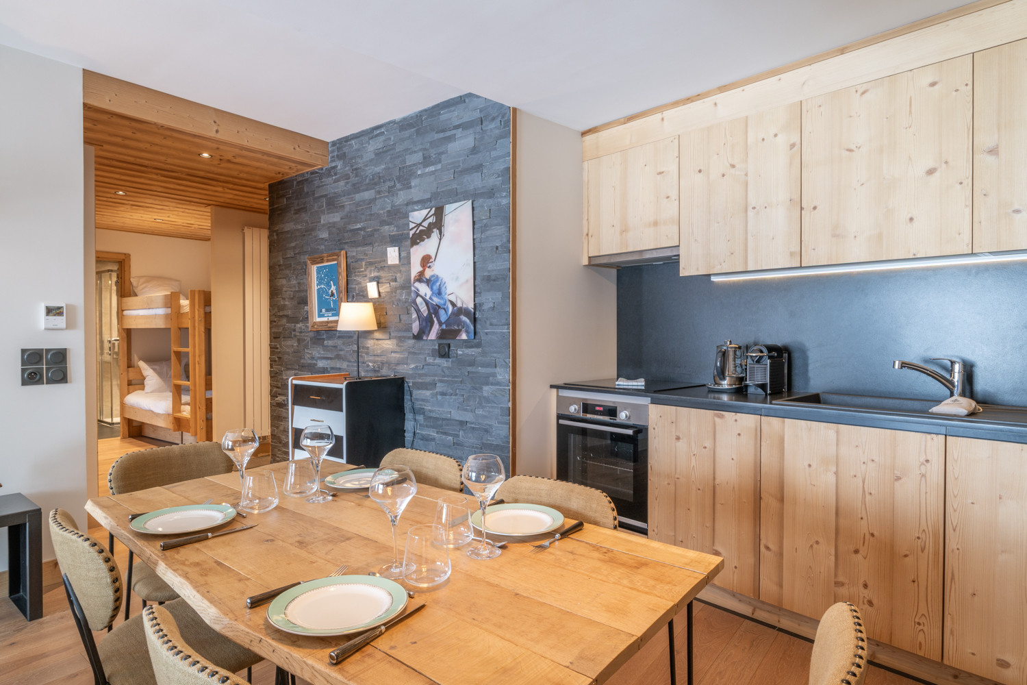 The open-plan kitchen flows into a bright and welcoming living area, benefiting from a lovely south-west exposure. Fully equipped, the kitchen offers everything you need for a comfortable stay: oven, microwave, dishwasher, filter coffee machine and Nespresso machine, as well as fondue and raclette sets.