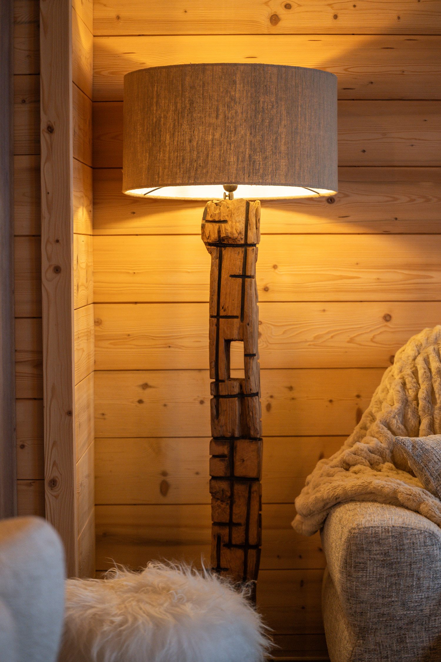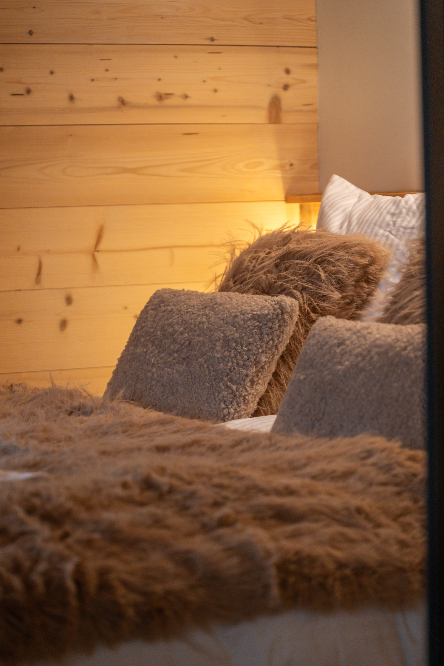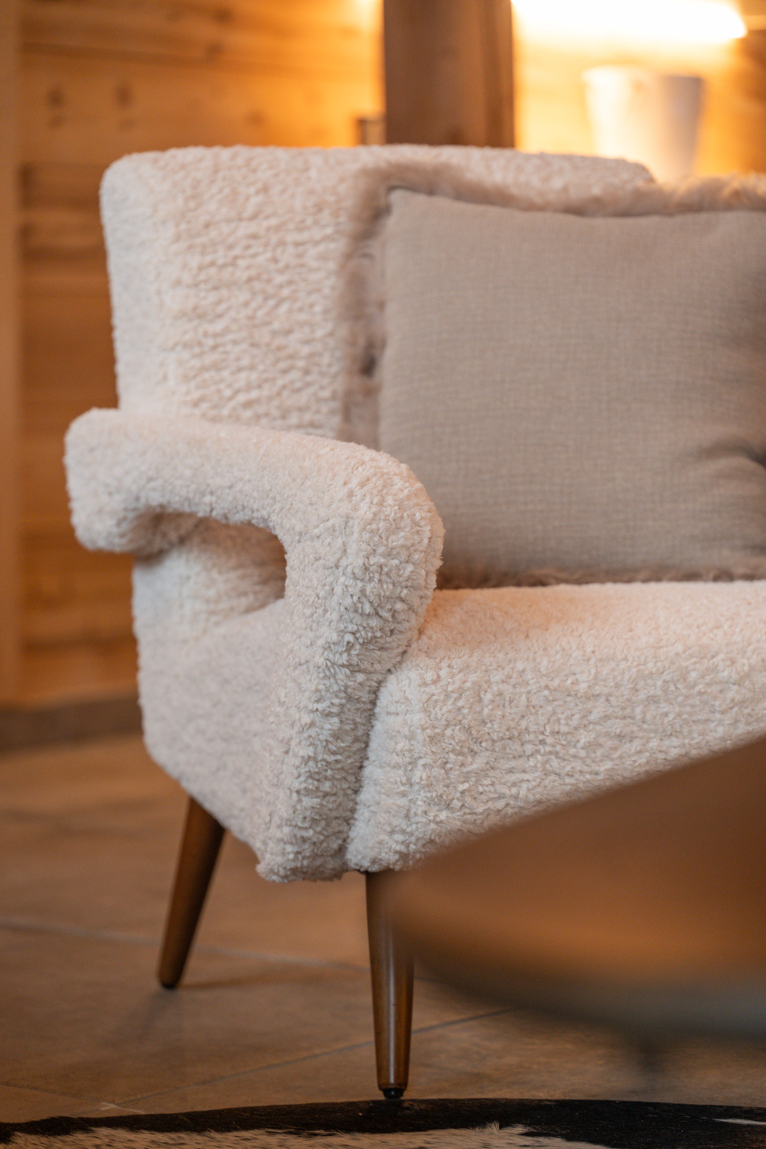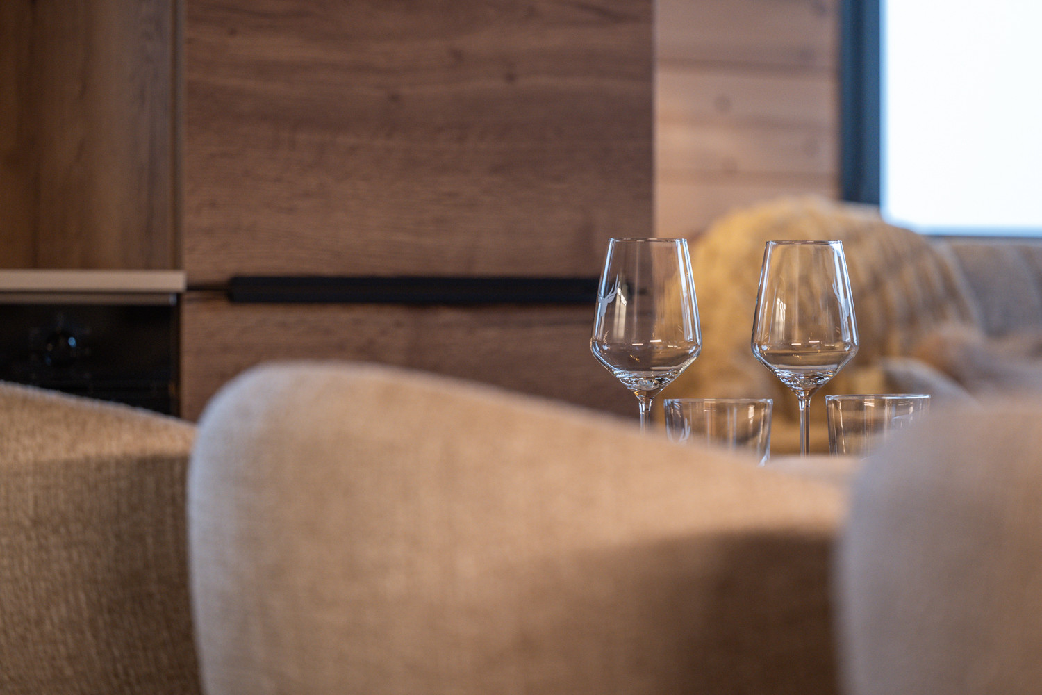 Le poêle à granules dans le salon crée une ambiance chaleureuse et cosy, idéale pour se retrouver après une journée en montagne.