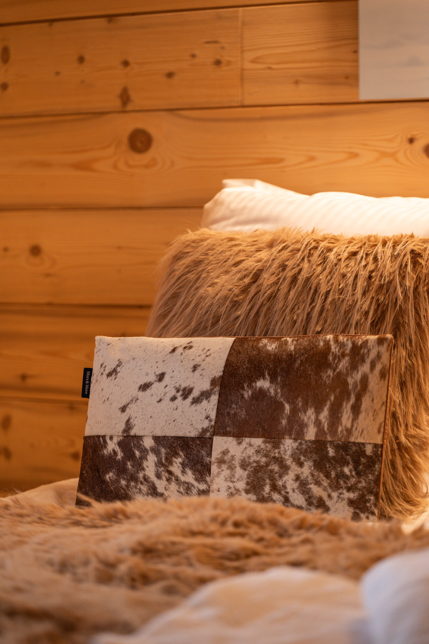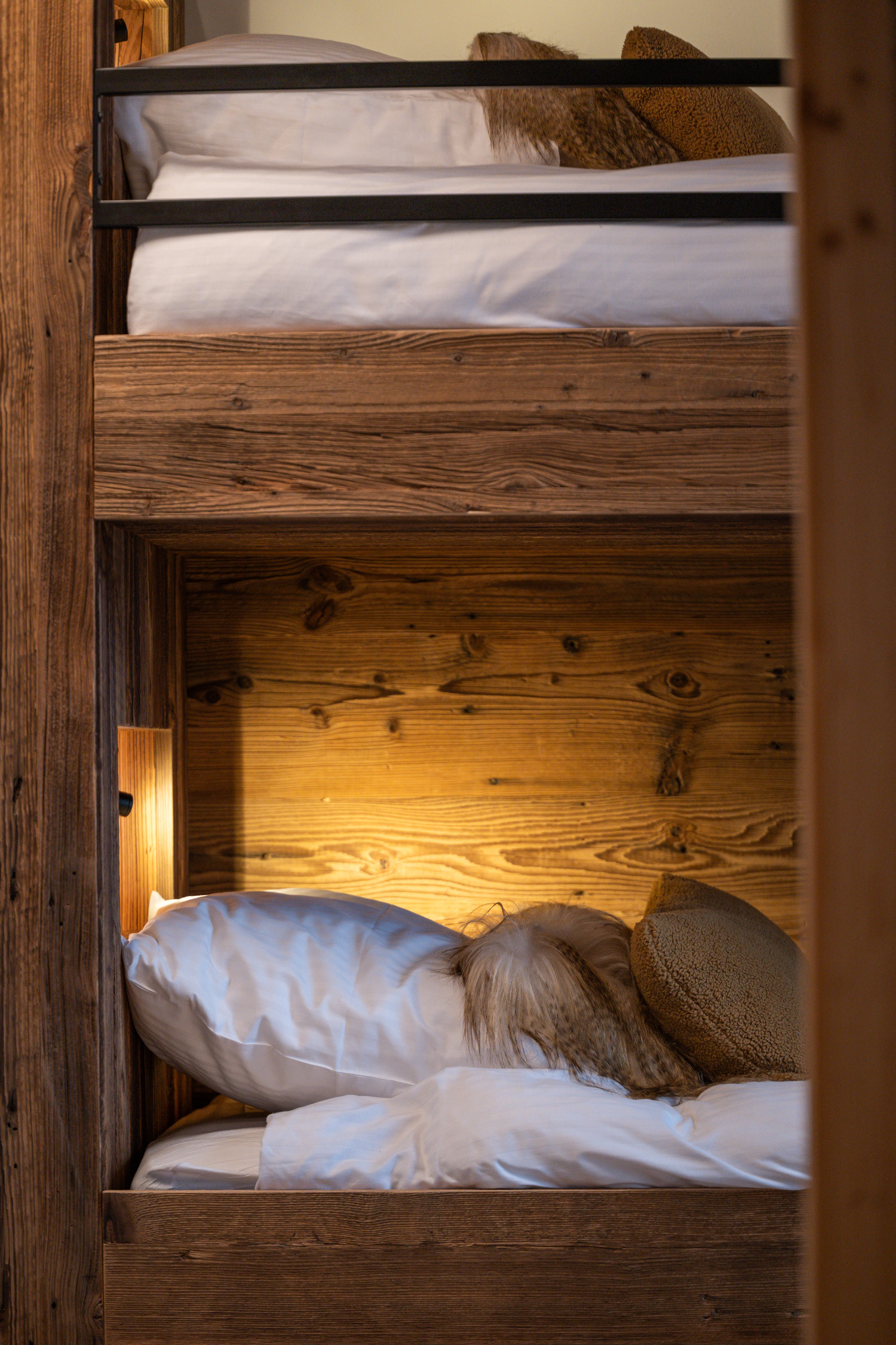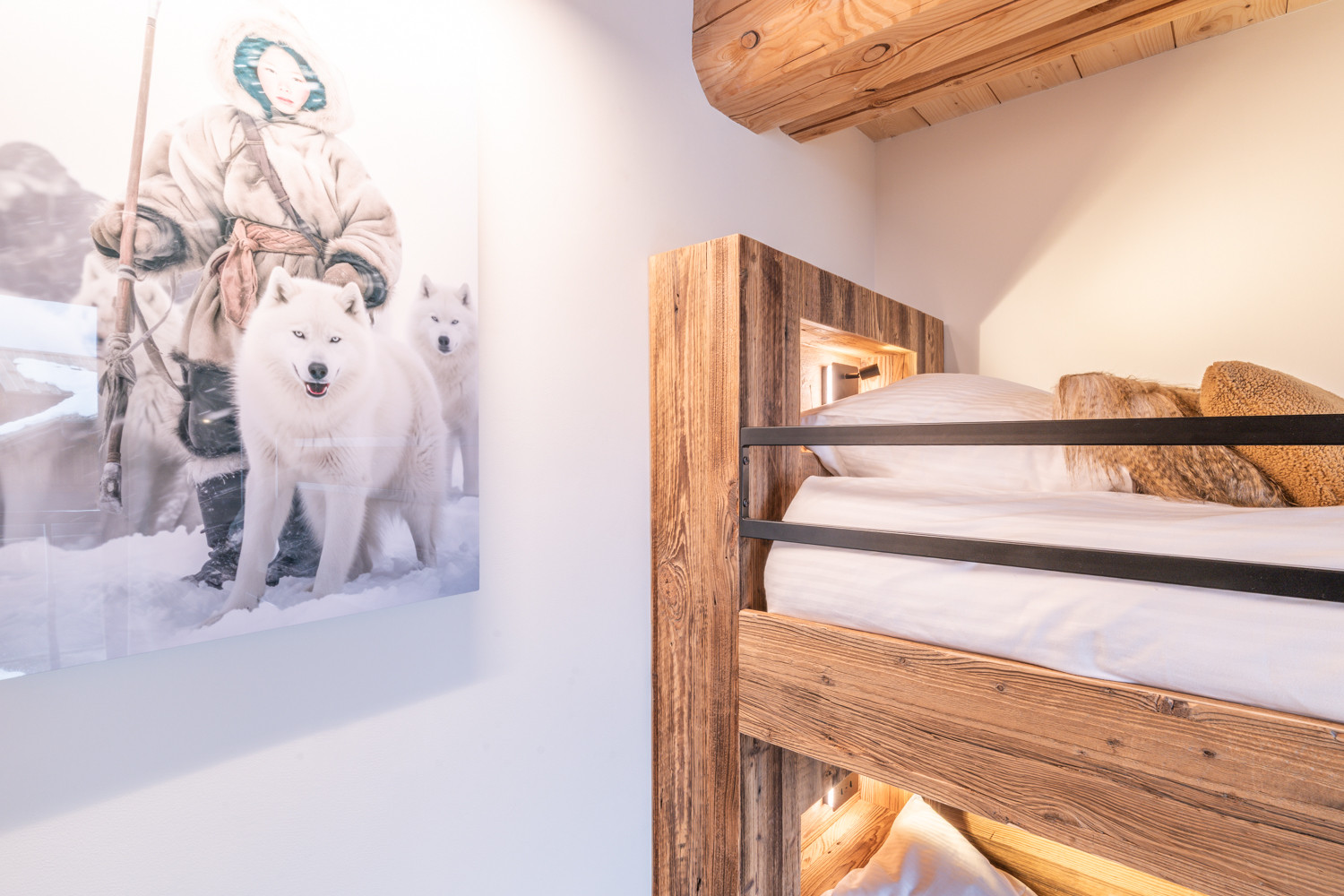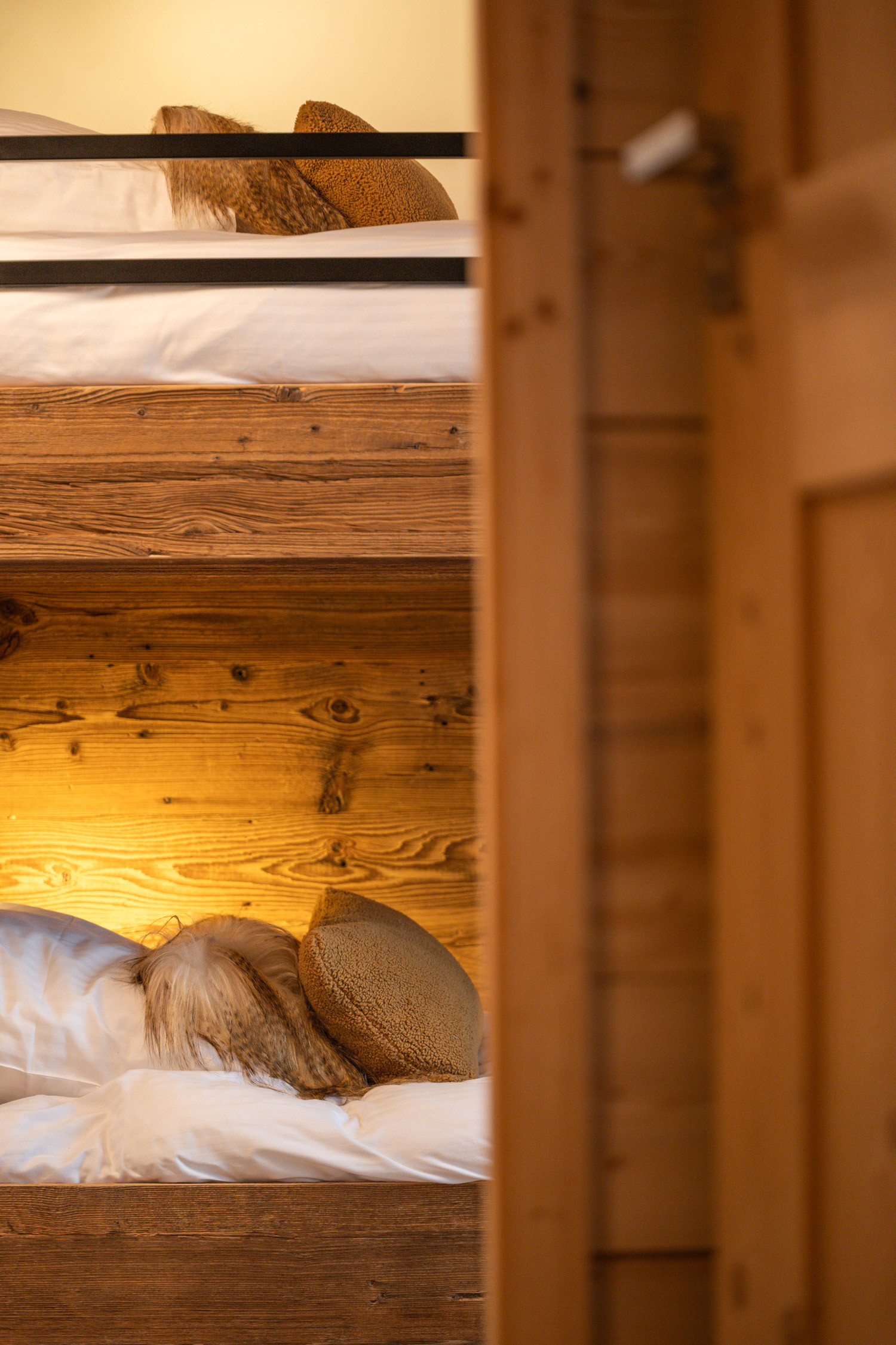 Le poêle à granules dans le salon crée une ambiance chaleureuse et cosy, idéale pour se retrouver après une journée en montagne.