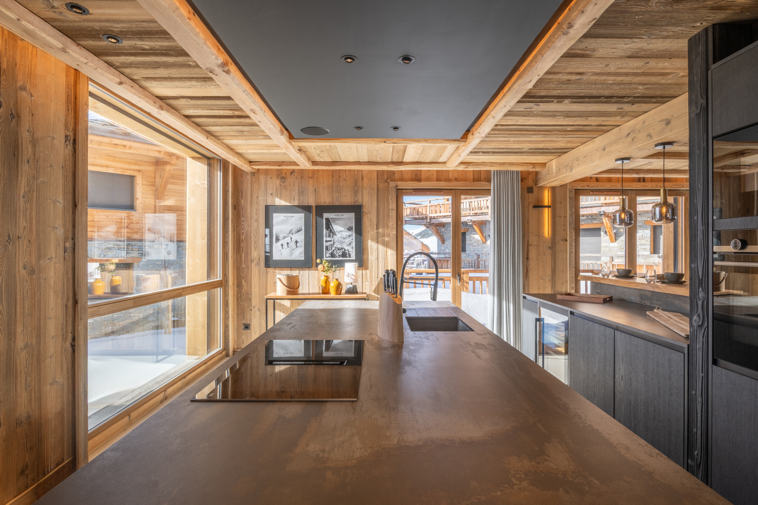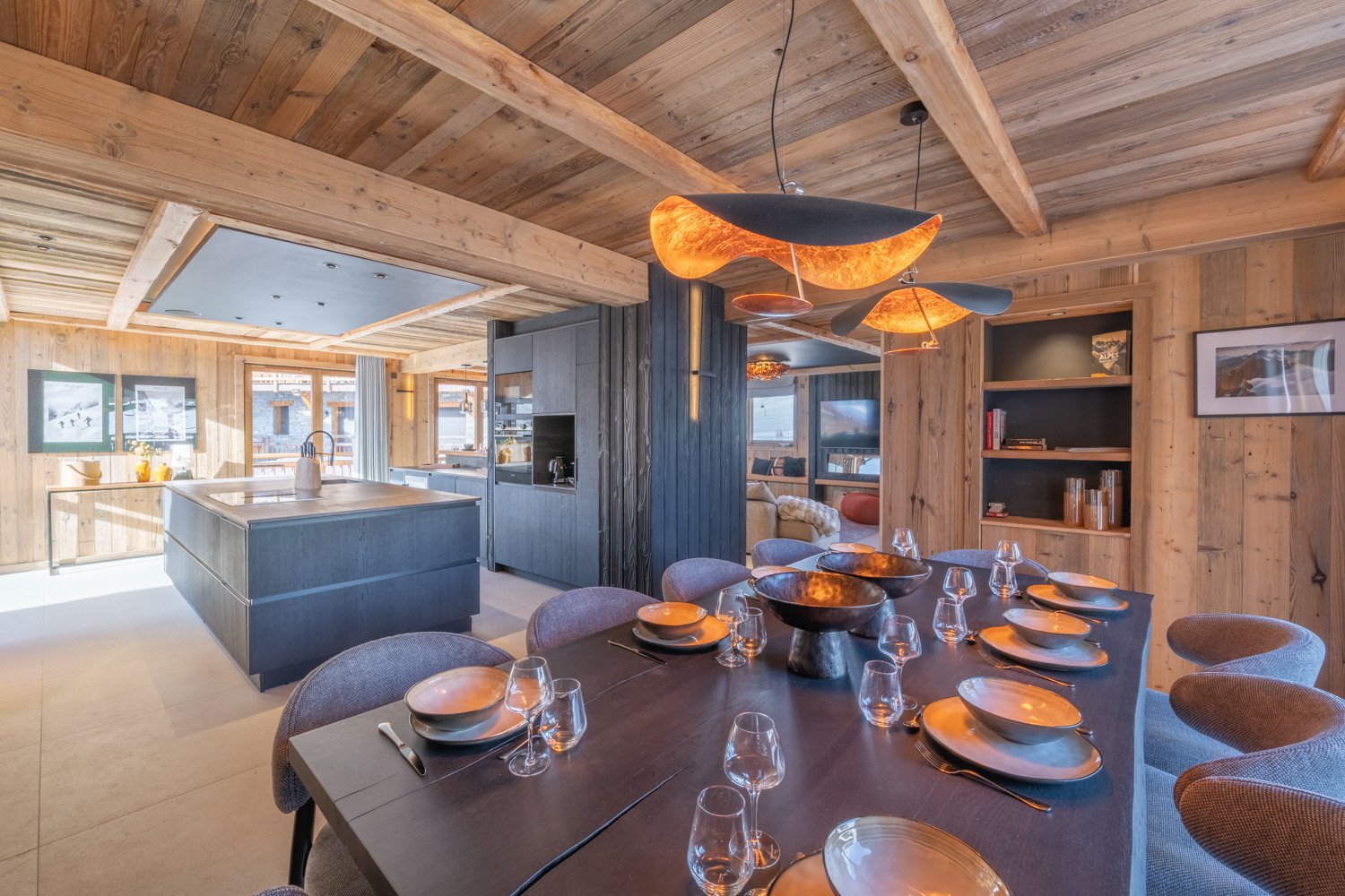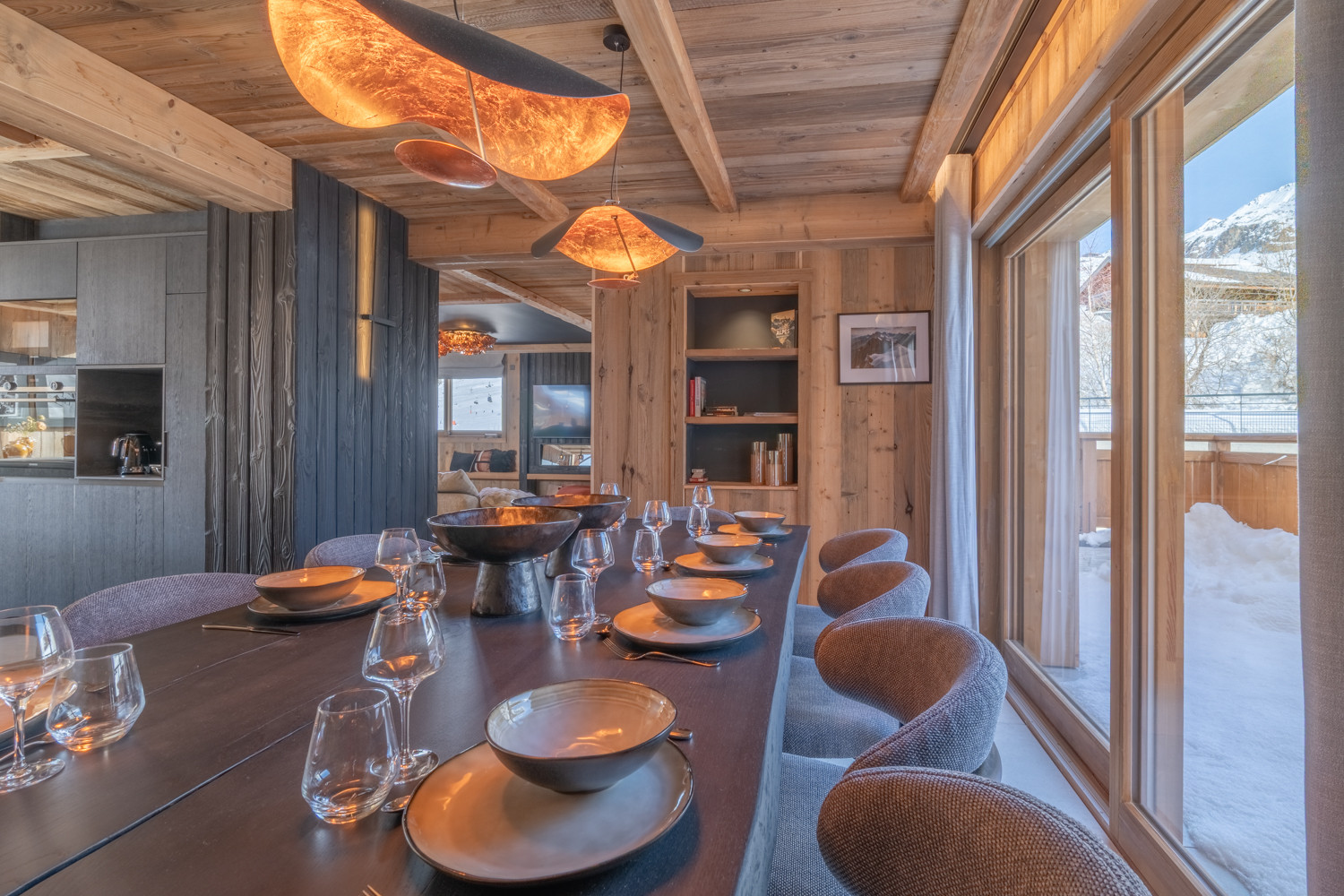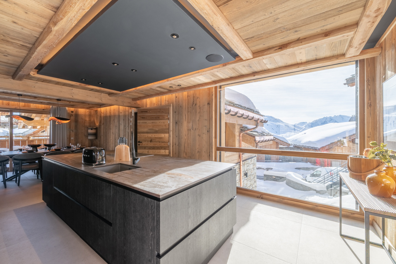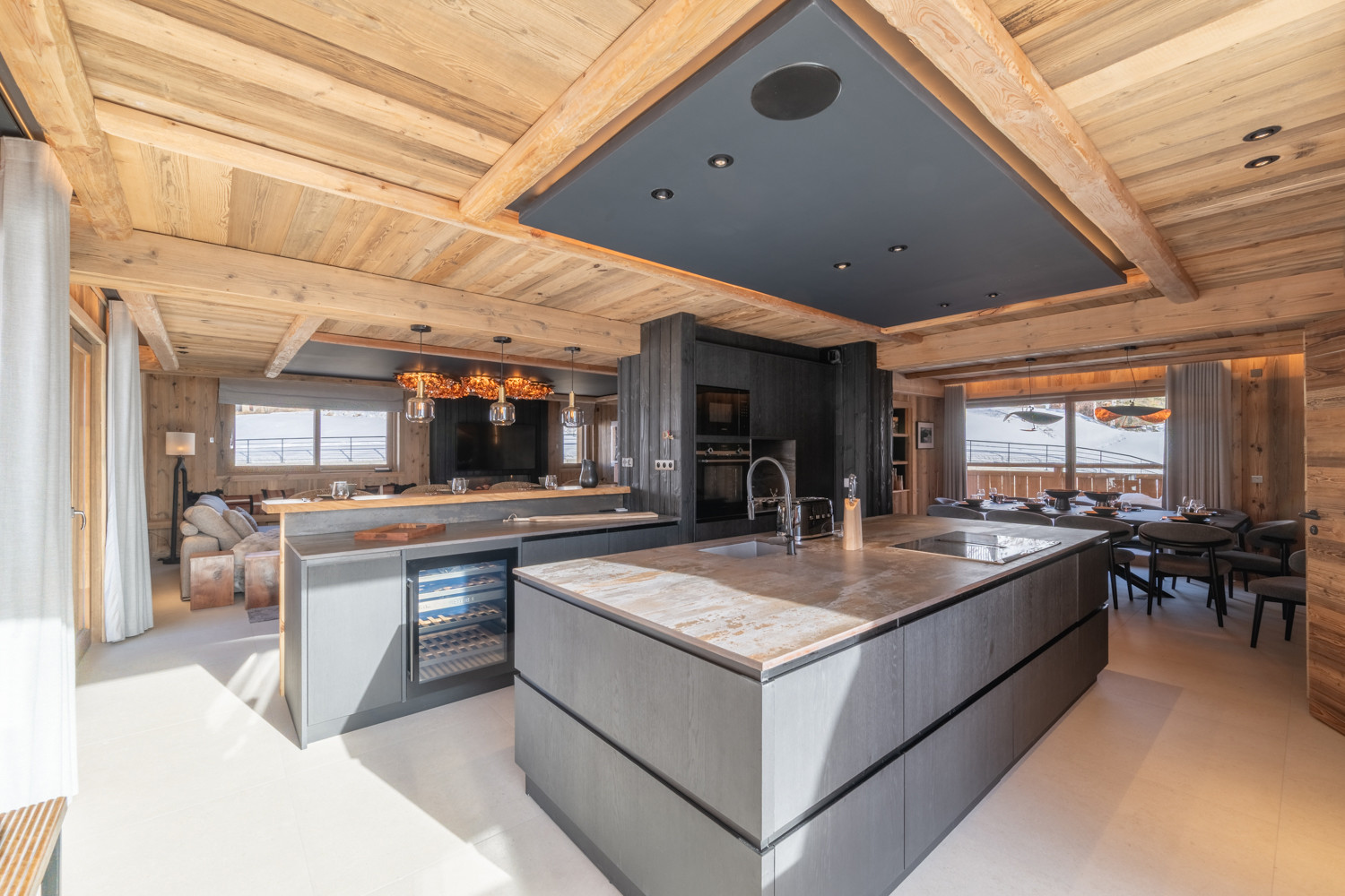 La cuisine américaine, ouverte sur le séjour, offre une vue imprenable sur les montagnes et dispose de tous les équipements nécessaires à votre séjour : four, micro-ondes, deux lave-vaisselles, machine à café filtre et Nespresso, appareils à fondue et raclette, cave à vin, congélateur table top, etc.