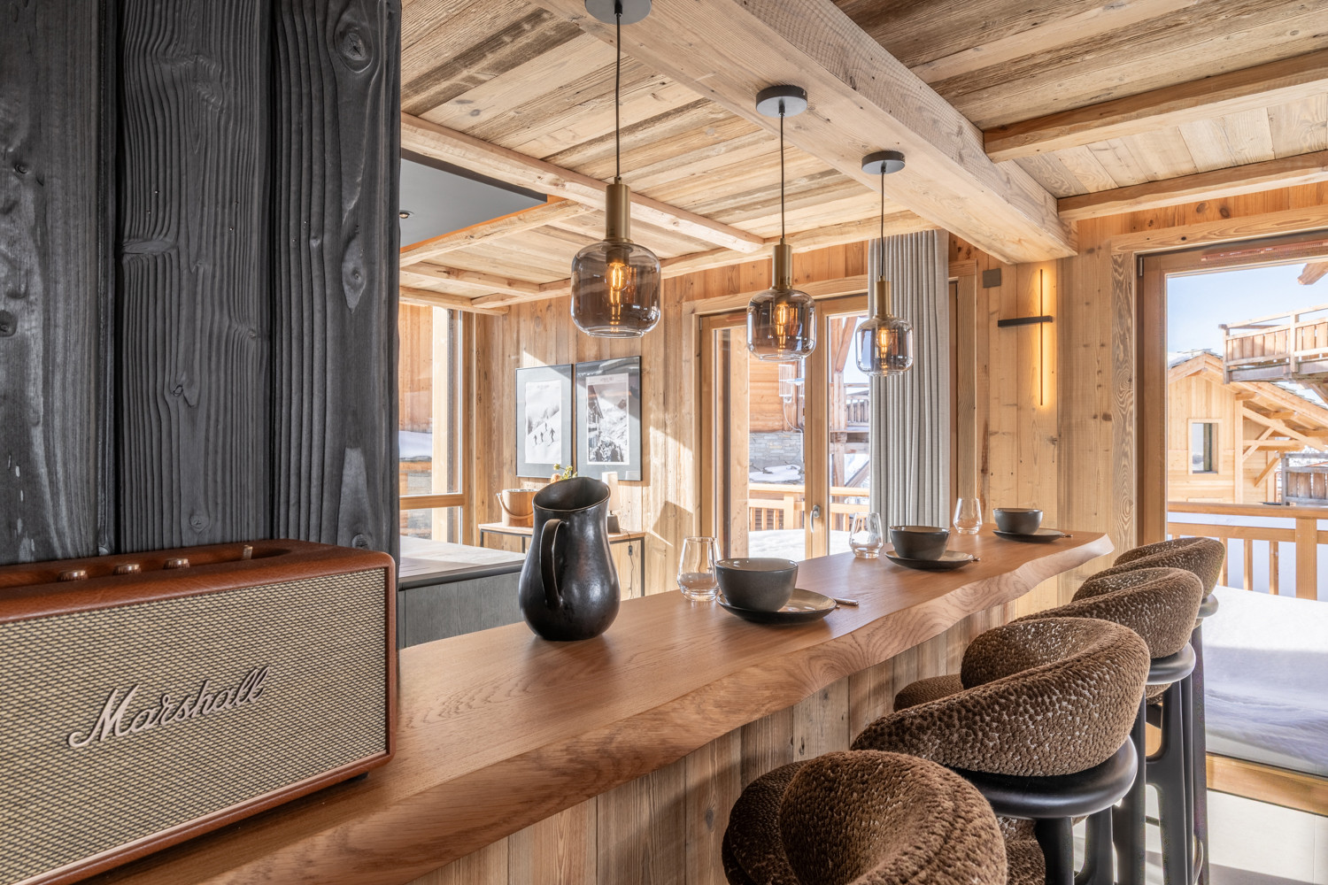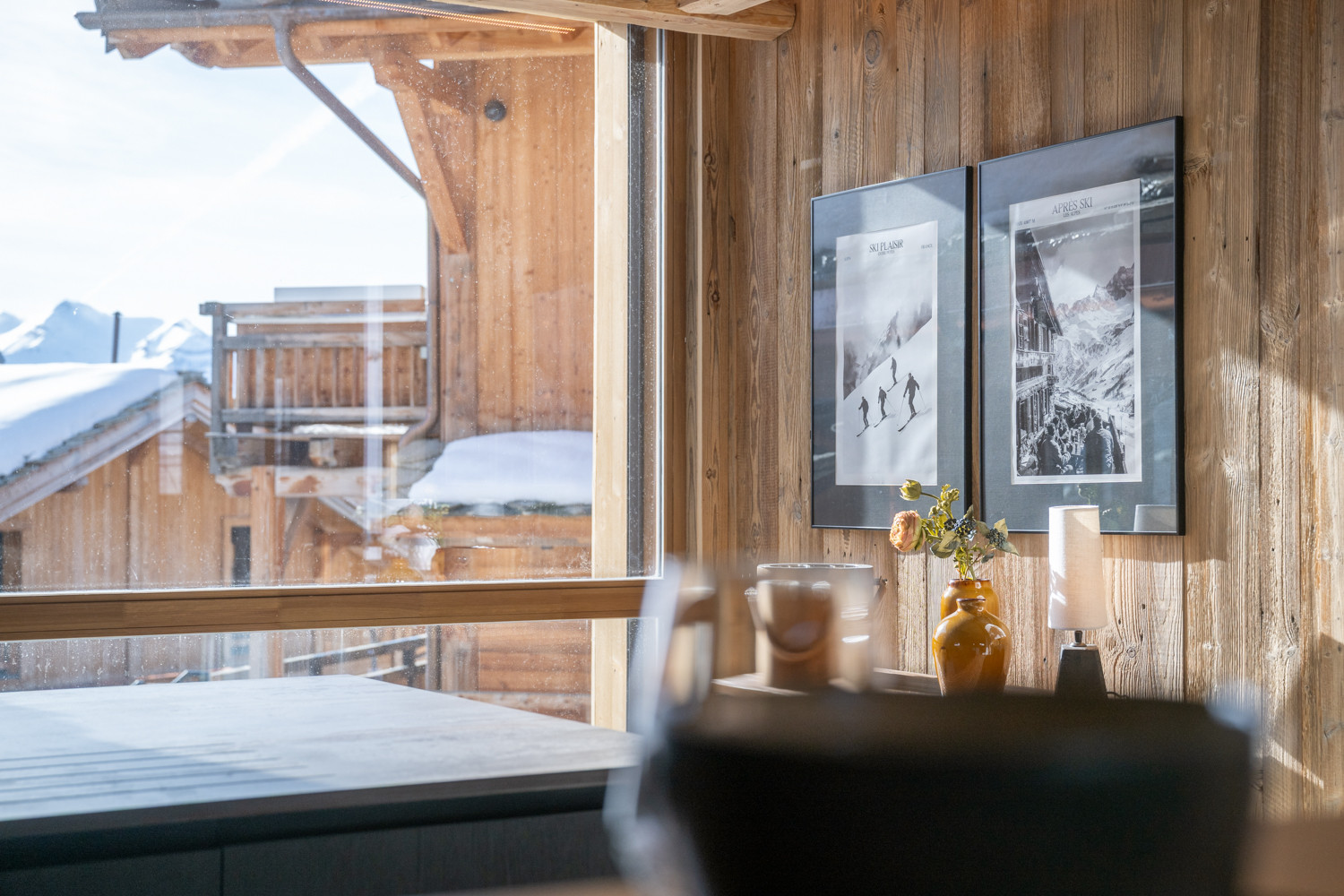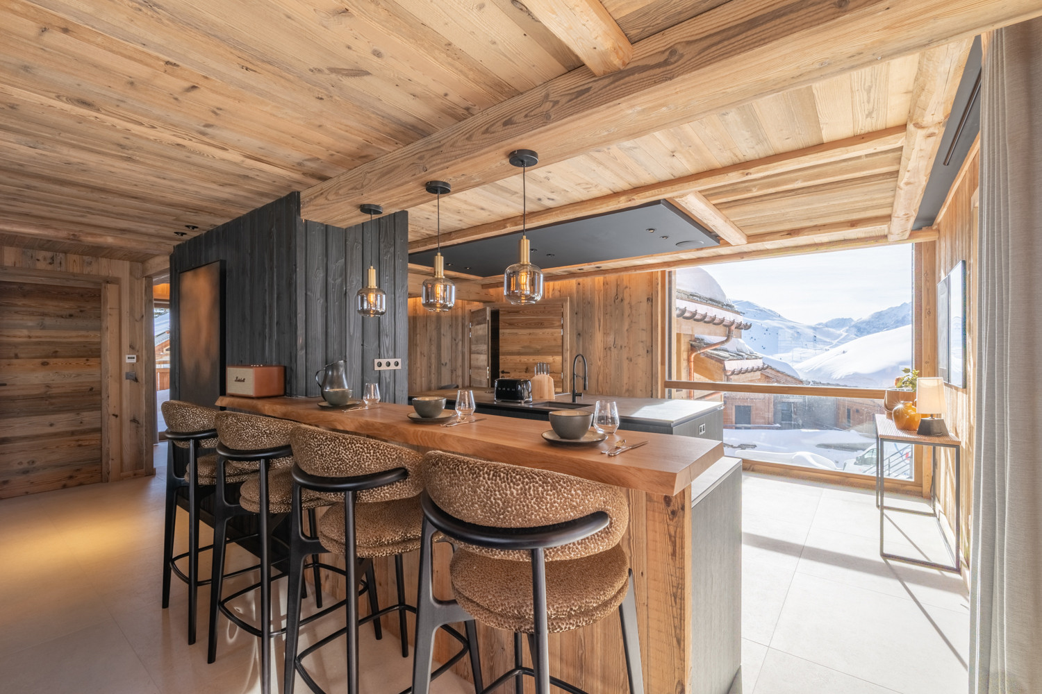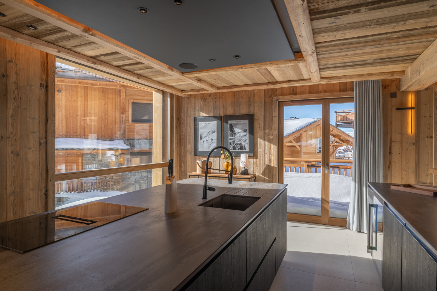 La cuisine américaine, ouverte sur le séjour, offre une vue imprenable sur les montagnes et dispose de tous les équipements nécessaires à votre séjour : four, micro-ondes, deux lave-vaisselles, machine à café filtre et Nespresso, appareils à fondue et raclette, cave à vin, congélateur table top, etc.
