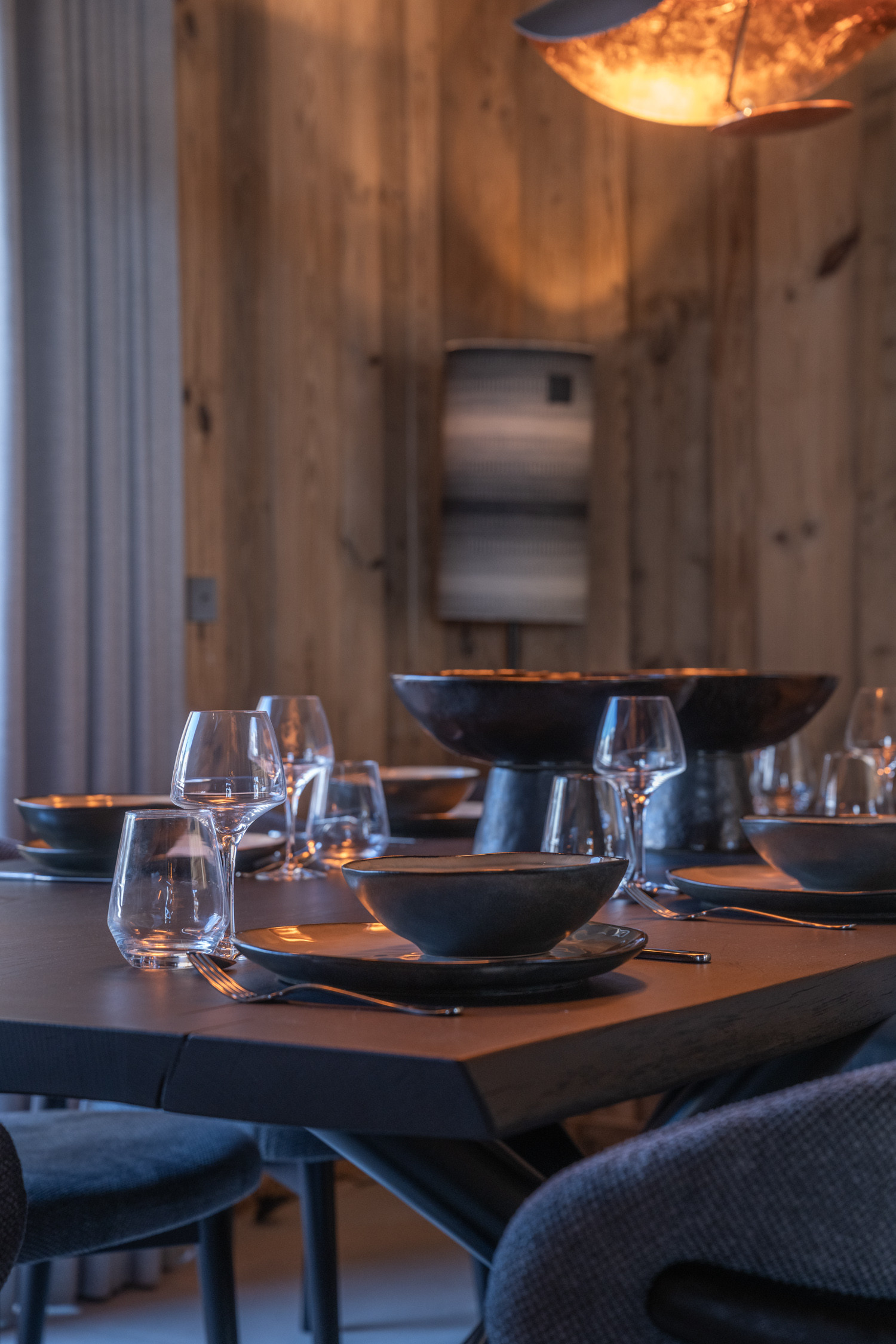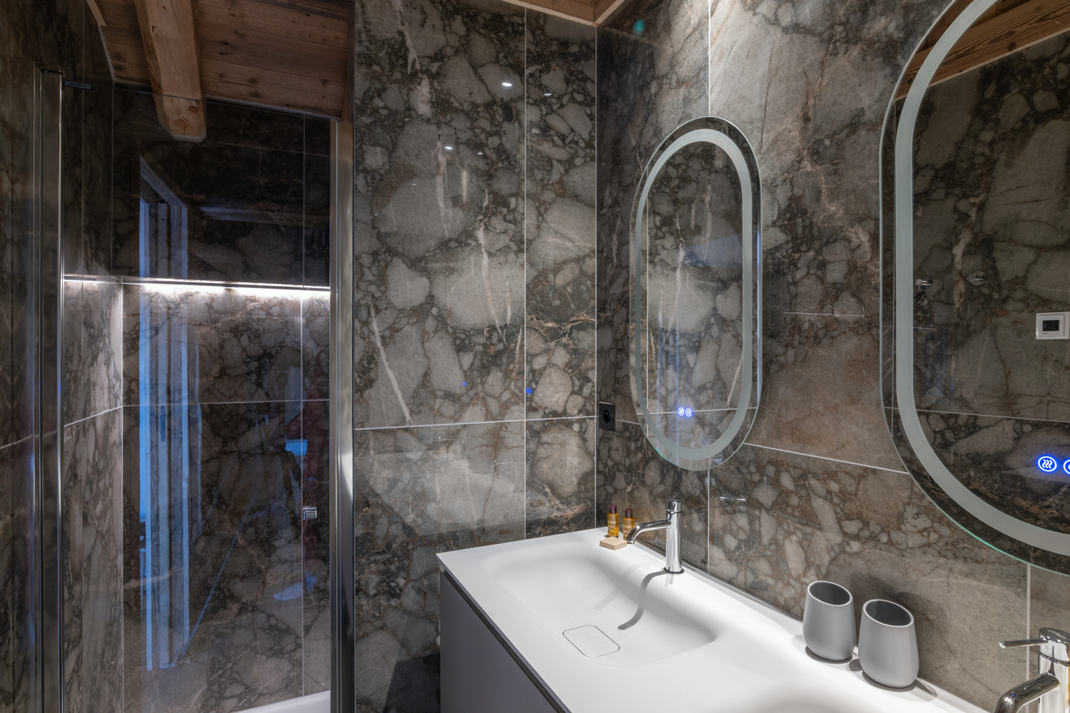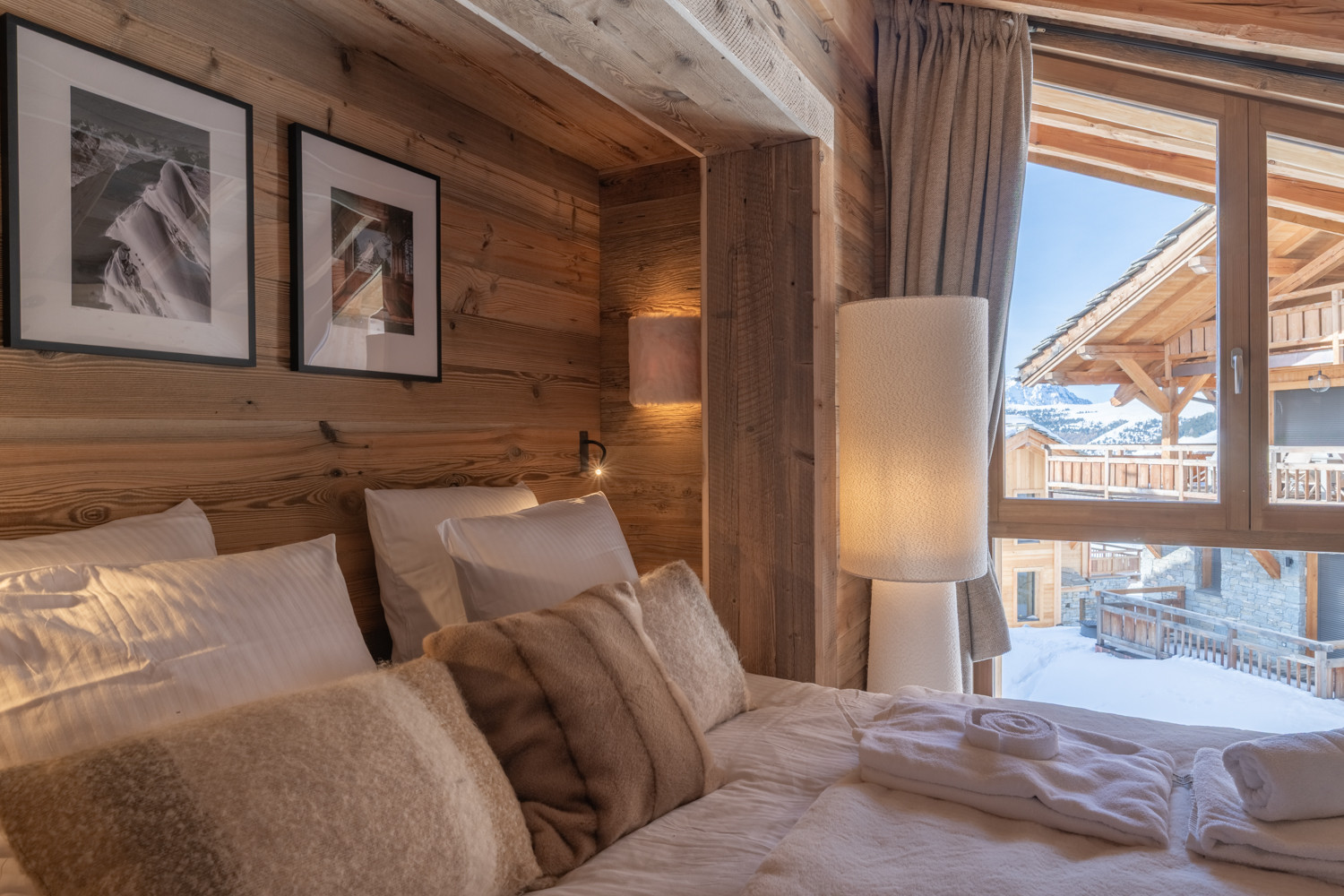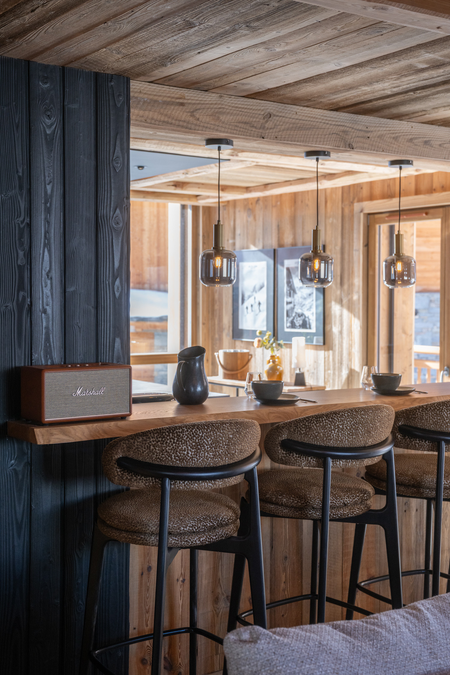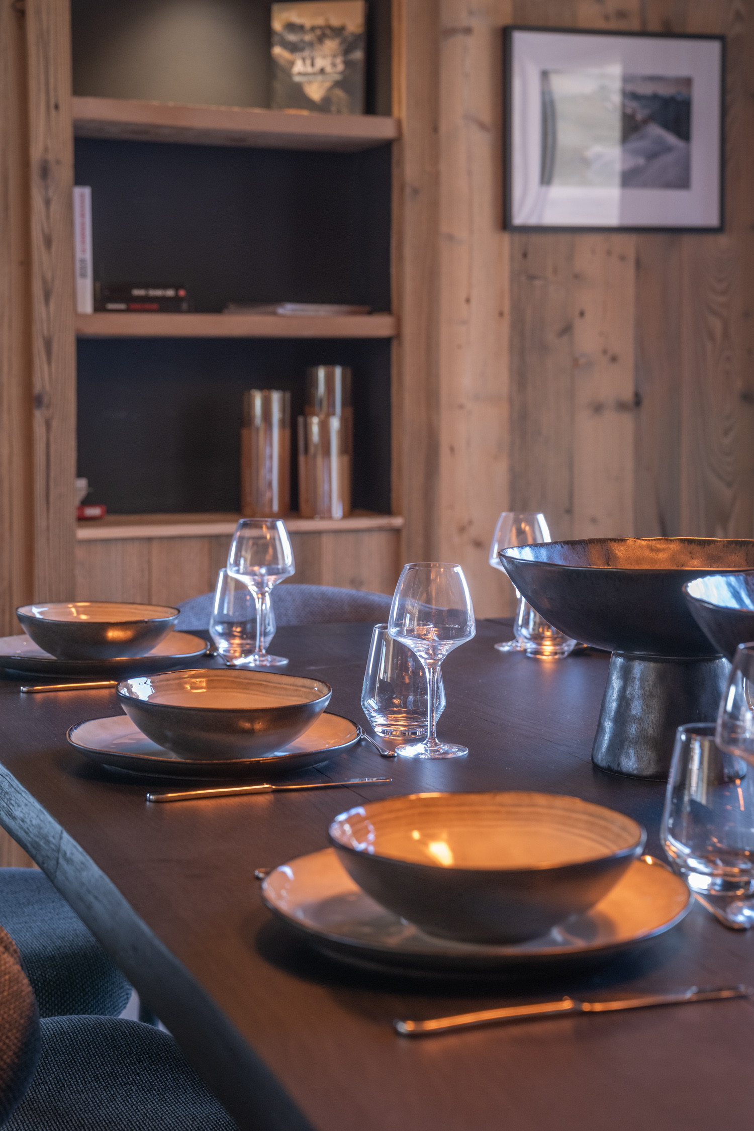 La cuisine américaine, ouverte sur le séjour, offre une vue imprenable sur les montagnes et dispose de tous les équipements nécessaires à votre séjour : four, micro-ondes, deux lave-vaisselles, machine à café filtre et Nespresso, appareils à fondue et raclette, cave à vin, congélateur table top, etc.