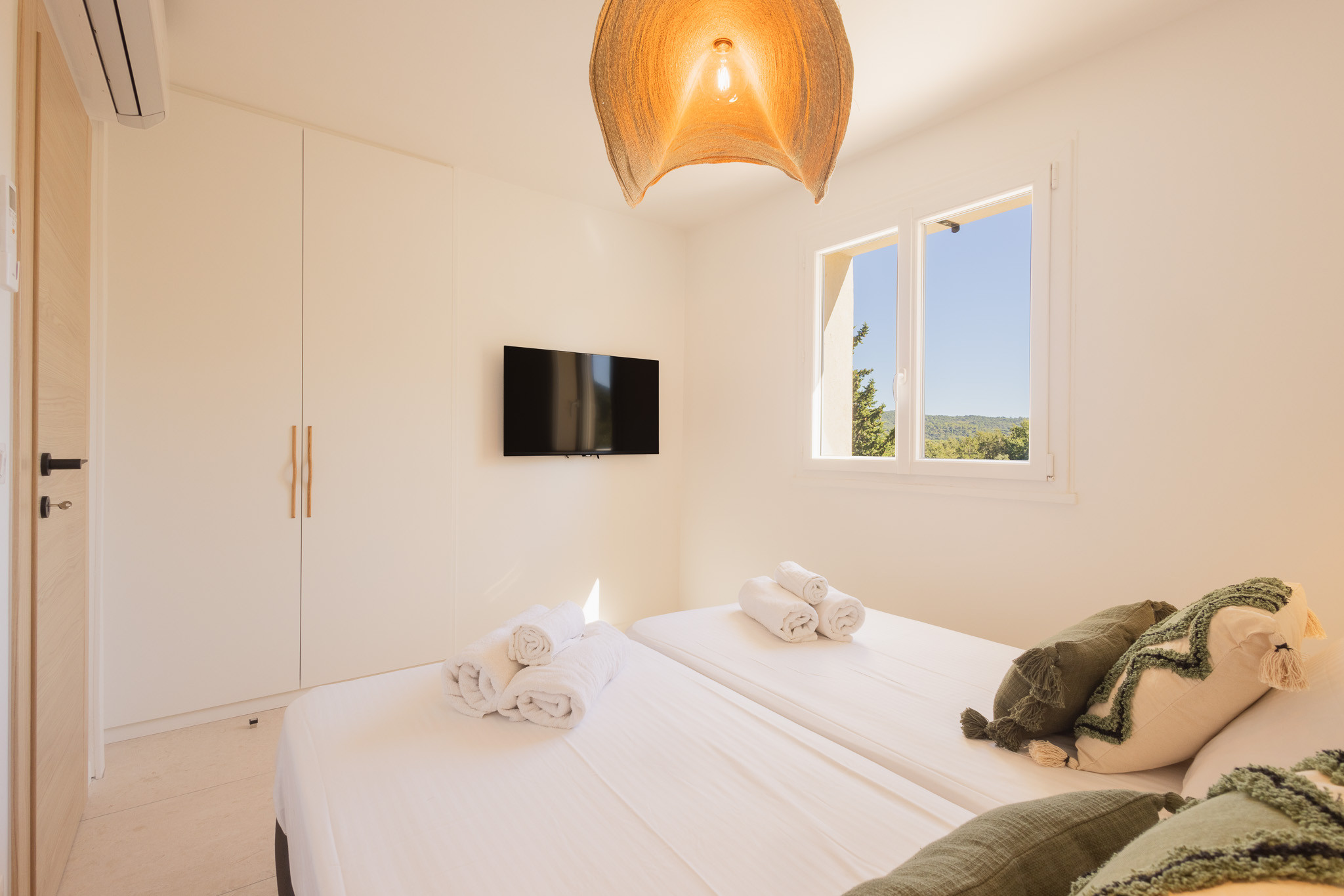 Avec ses 5 chambres (dont 4 qui disposent de la climatisation) vous aurez tout l'espace nécessaire pour vous accueillir entre amis ou en famille. La chambre master avec des rangements intégrés, salle de bain avec douche, baignoire et double vasque, donnent sur une merveilleuse terrasse surplombant la colline de Gassin.