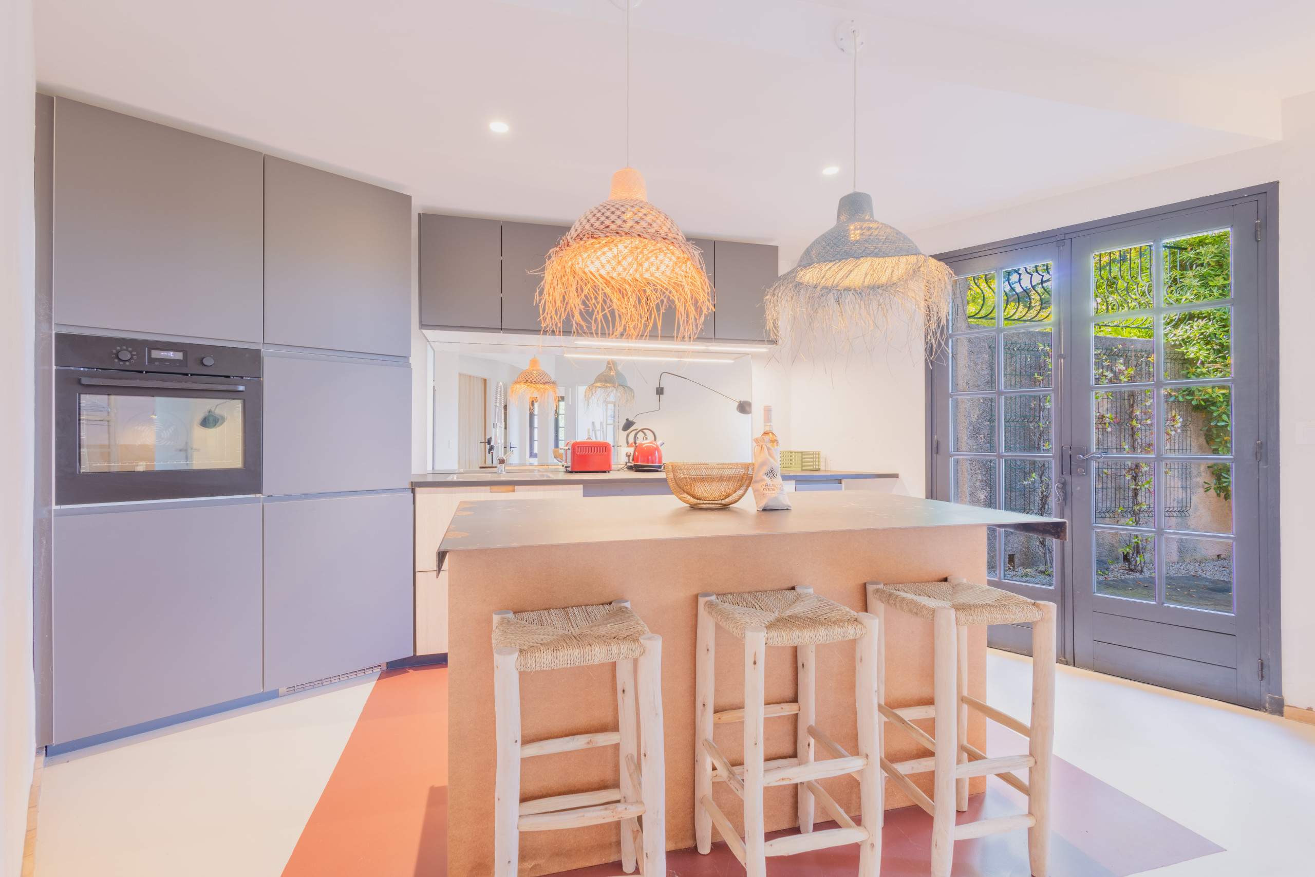 La maison principale se compose de 3 chambres, 2 salles de bain, et d’un vaste salon baigné de lumière, ouvert sur le jardin et les terrasses.