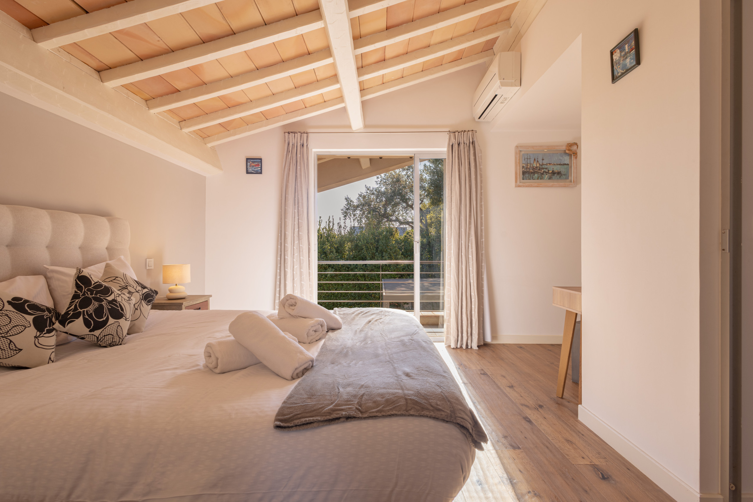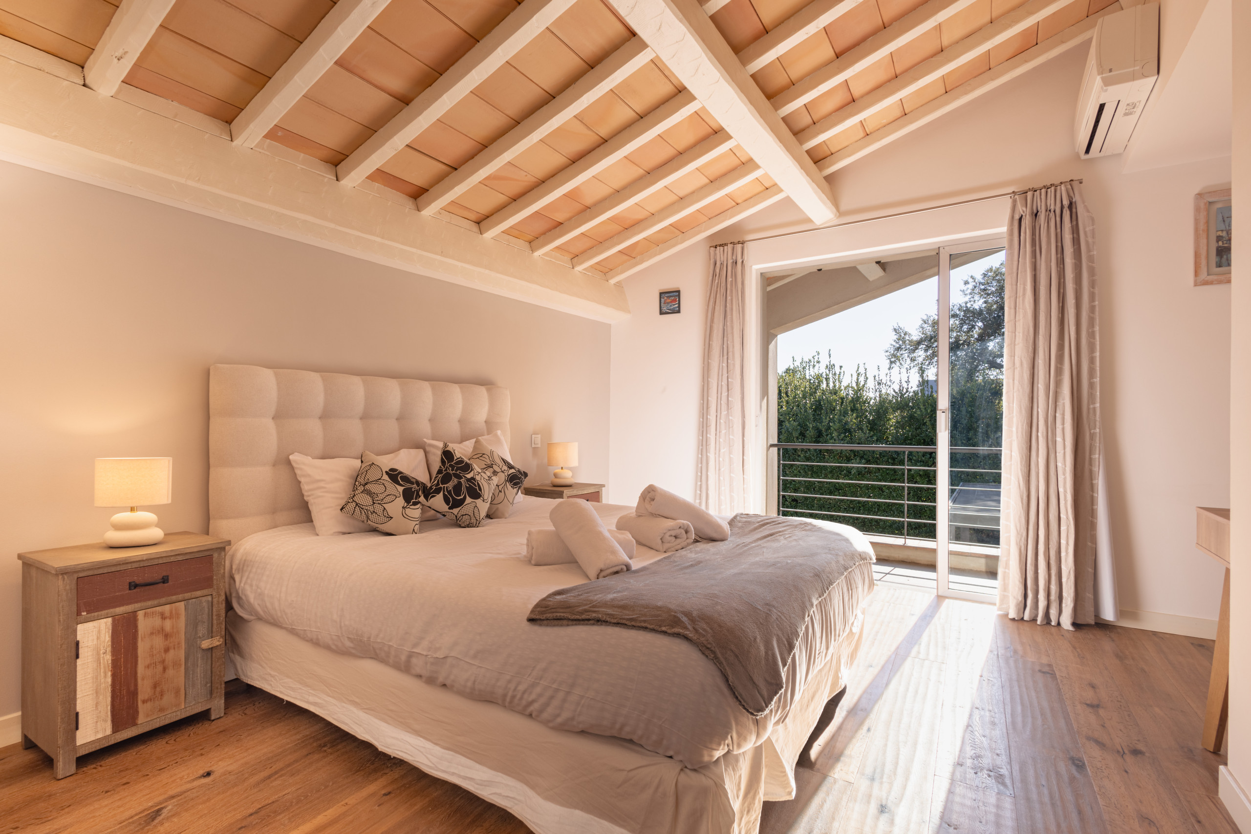 Toutes les pièces sont climatisées et l’avancée du toit de la maison permet de se protéger des fortes chaleurs et garde l’intérieur au frais.